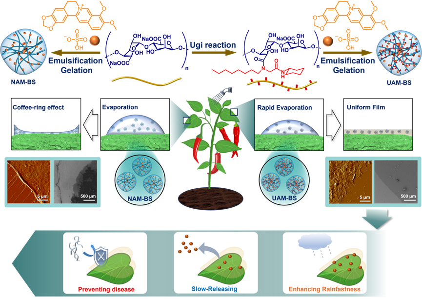 研究结果显示,表面活性较高的小檗碱微凝胶可以在蒸发过程中在液滴气-液表面完成吸附,减少液滴蒸发过程中的马拉格尼流的影响,实现农药液滴的均匀沉积。此外,表面活性较高的小檗碱微凝胶溶液也对辣椒炭疽病的防控提供保护作用。研究结果不仅提出了一种具有良好沉积均匀性的农药制剂,同时也为调控农药药液蒸发沉积行为提供了新思路。