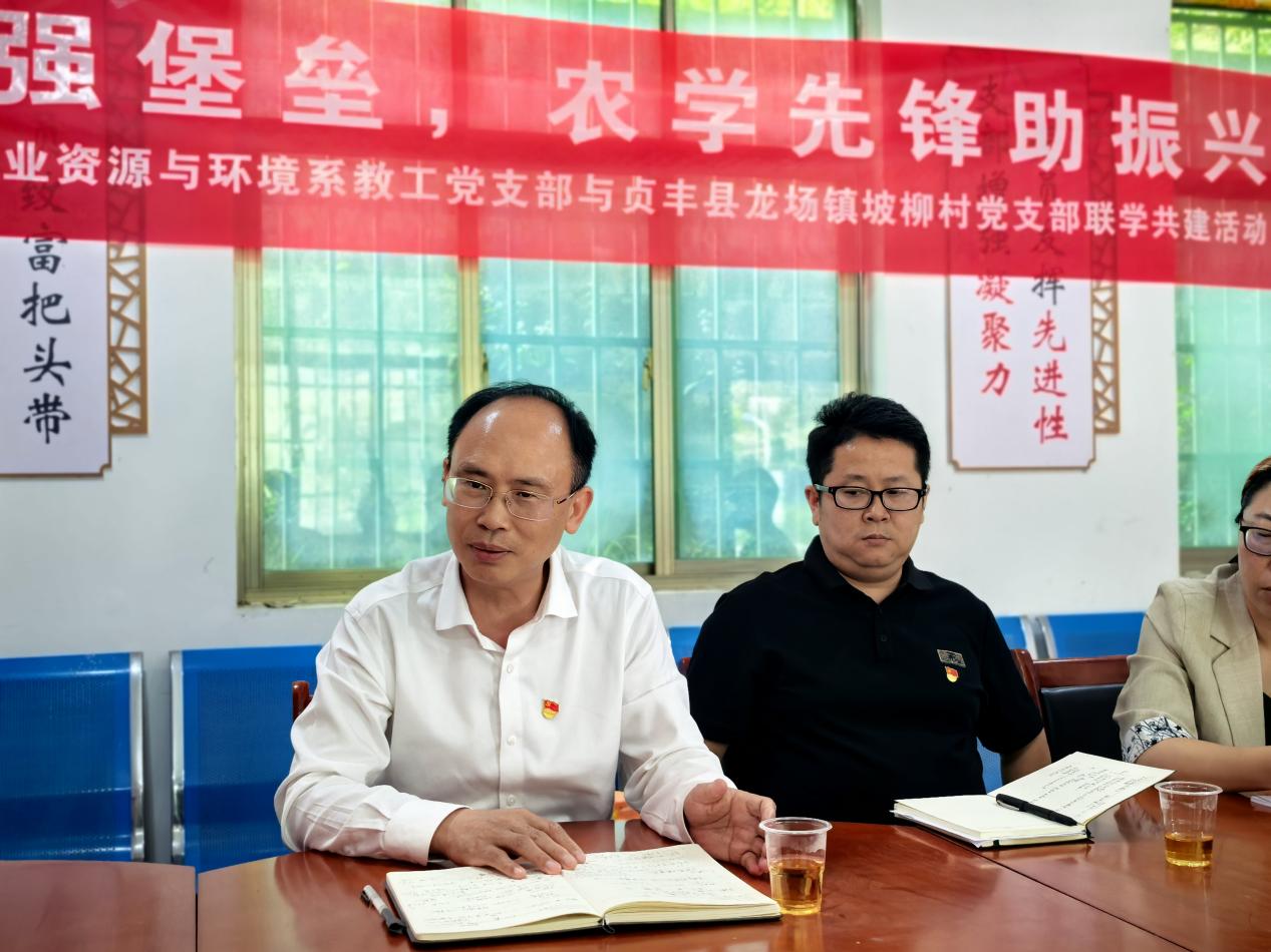 交流发言环节,赵路玥同志提到,通过联学共建可实现优势互补,针对坡柳村农业生产中的实际问题,可发挥农资系教工党支部的专业特长,开展技术培训、田间指导与项目合作,助力当地特色农业提质增效,促进农民增收致富。余飞、蒙家鹏同志在发言中对98858vip威尼斯下载的长期帮扶表示了感谢,并期待下一步双方的结对共建以项目的形式落地,通过产学研深度融合,建立长期稳定的合作机制,为坡柳村农业绿色发展提供持续性技术支持与人才保障。