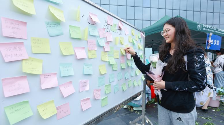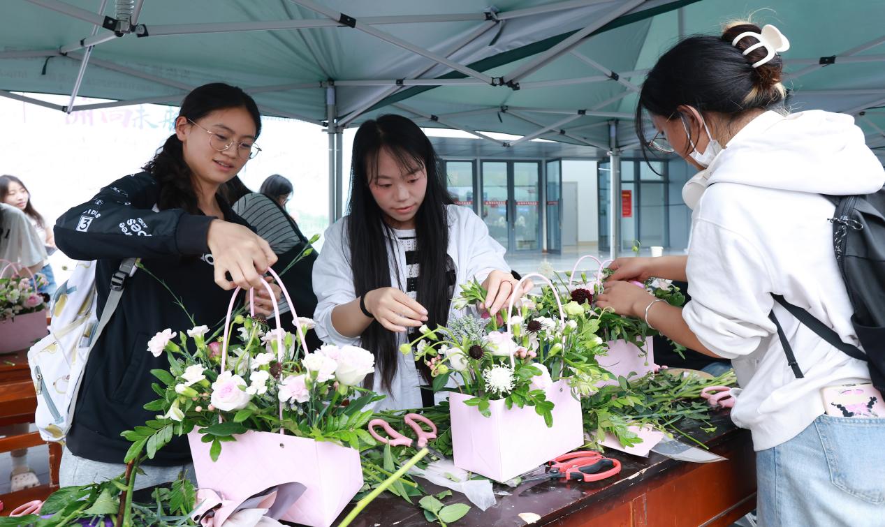 活动伊始,同学们在心愿卡上写下对未来的期许,如“愿考研上岸”“友谊长存”等。花材选取区摆放着玫瑰、康乃馨、洋桔梗等十余种鲜花。参与者在志愿者的引导下,依据花色与花语自主搭配,创作出各具特色的个性花束。