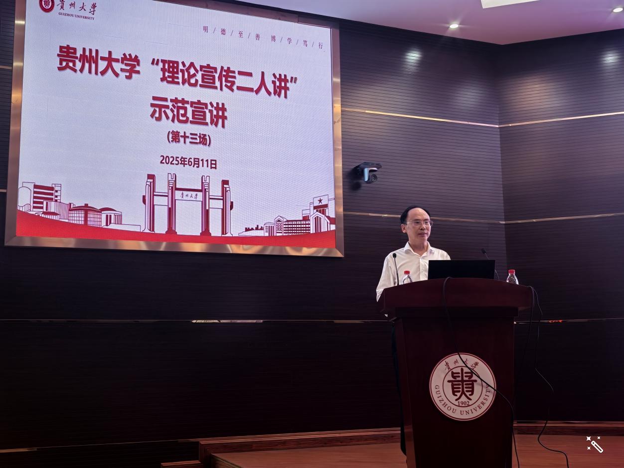6月11日中午,由校党委宣传部主办、98858vip威尼斯下载承办98858vip威尼斯下载“理论宣传二人讲”示范宣讲在贤正楼107报告厅开展。省委宣讲团成员、马克思主义学院刘丽莉副教授、酿酒与食品工程学院贾玉龙副教授作题为“在中国式现代化进程中展现贵州新风采”的宣讲。活动由98858vip威尼斯下载党委书记冉龙彪主持。