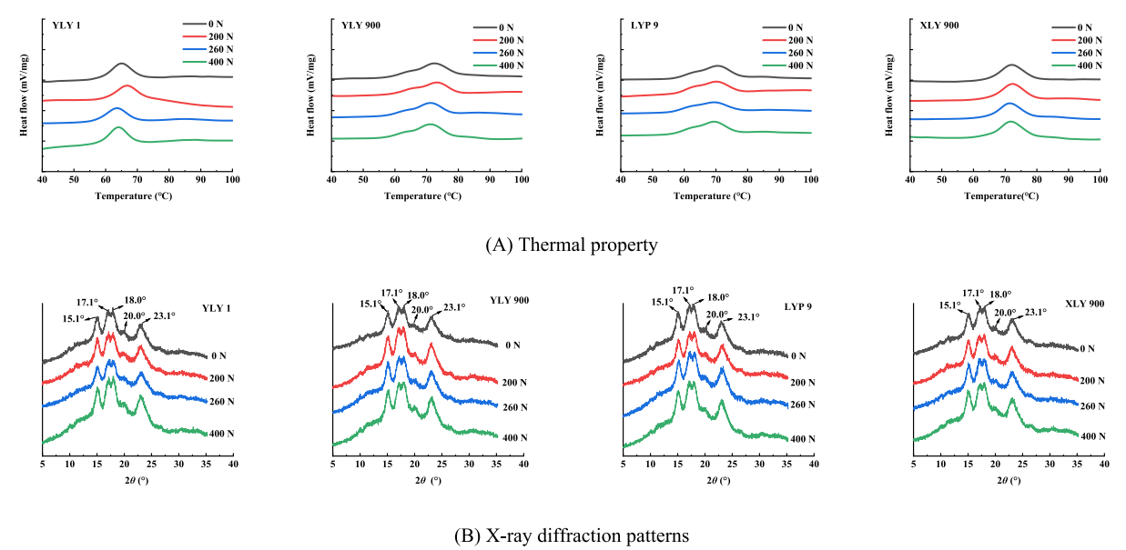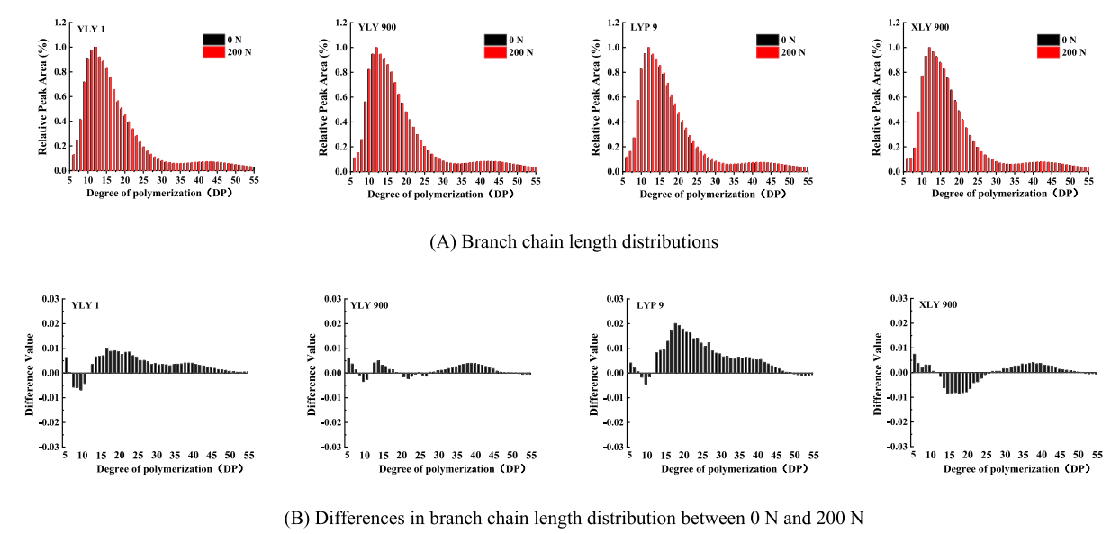探讨了不同氮肥水平对淀粉理化性质的影响,随着施氮量的增加,糊化温度(Tp)先增加后下降,在200 N处理时达到峰值,氮肥对四个品种To的影响表现出相同的趋势。高氮处理不改变淀粉的晶体类型而降低其相对结晶度和短程有序性。在200 N处理下支链淀粉中短链fa(DP 6–12)的比例显著降低,而长链fb3(DP≥37)增加,最终导致平均链长增大。