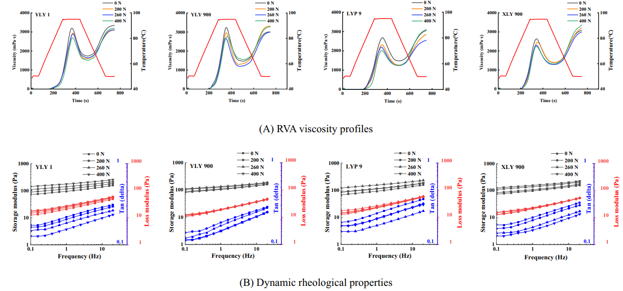 流变学特性是影响稻米加工的重要特性。随着施氮量的增加,峰值黏度(PKV)显著下降,而崩解值和消减值(SBV)则上升。YLY 1、LYP 9和XLY 900的储能模量(G')随施氮量的增加呈上升趋势,而损耗模量(G′′)变化不明显,最终导致tan δ (G′′/G′)低于对照组。碳氮平衡影响了AAC和蛋白质的含量,从而导致流变学特性的变化。