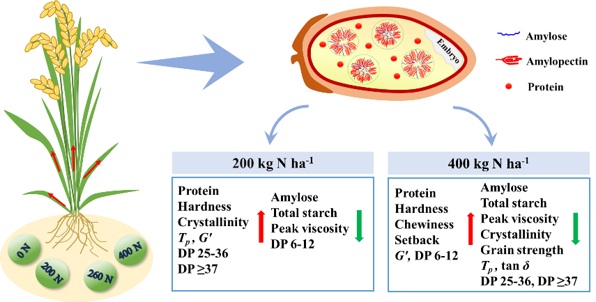 适量的氮肥处理可以促进淀粉发育,增加支链淀粉fb1、fb3链的比例和平均链长,同时减少短fa链。AAC的下降和淀粉分子结构的变化导致显著不同的糊化、热力学、流变学和质构特性。淀粉-蛋白质互作改变了米粉胶体网络结构,从而影响米饭的蒸煮和质构特性。四个超级杂交籼稻对氮肥水平的响应存在差异,但趋势一致。合理的氮肥施用对改善稻米品质和氮高效利用至关重要,但需要更多的研究证明氮肥如何调控碳氮平衡,从而影响水稻产量和品质。