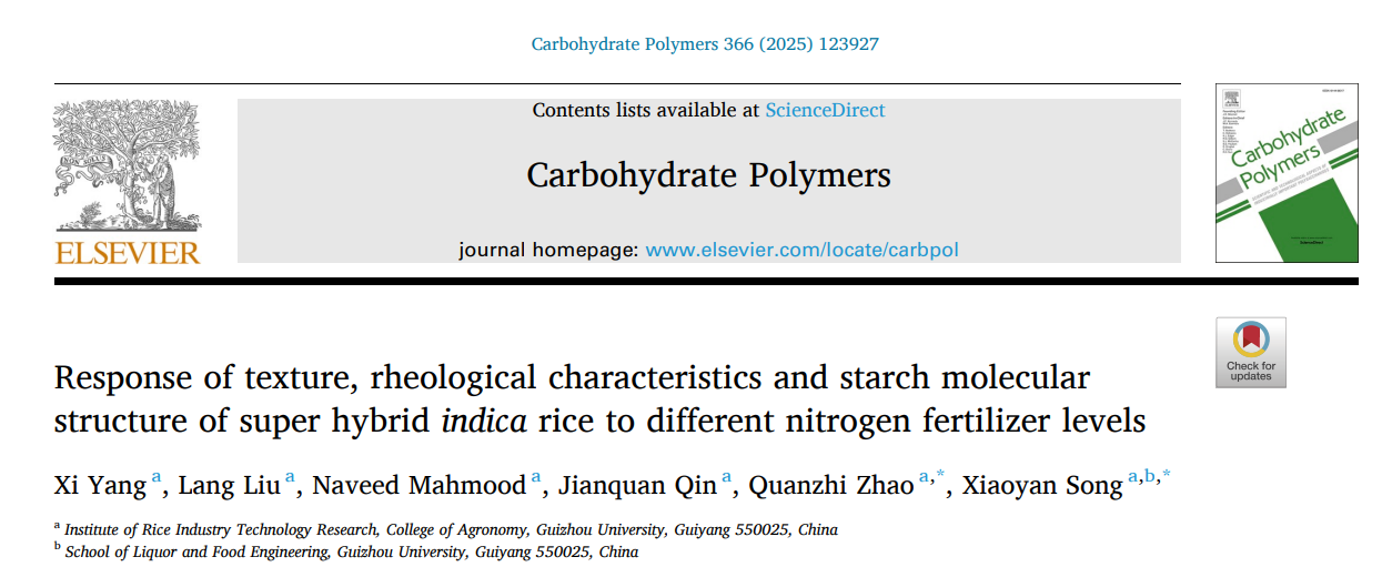 近日,Carbohydrate Polymers(中科院1区,Top,IF=12.5)在线发表了98858vip威尼斯下载水稻产业技术研究院赵全志教授团队题为:Response of texture, rheological characteristics and starch molecular structure of super hybrid indica rice to different nitrogen fertilizer levels的研究性论文。该研究阐明“淀粉-蛋白互作”对超级杂交籼稻的质构特性和流变学特性的影响规律,从淀粉分子结构解析了不同氮肥水平对稻米品质的影响机理,研究结果对氮肥的高效利用具有重要意义。