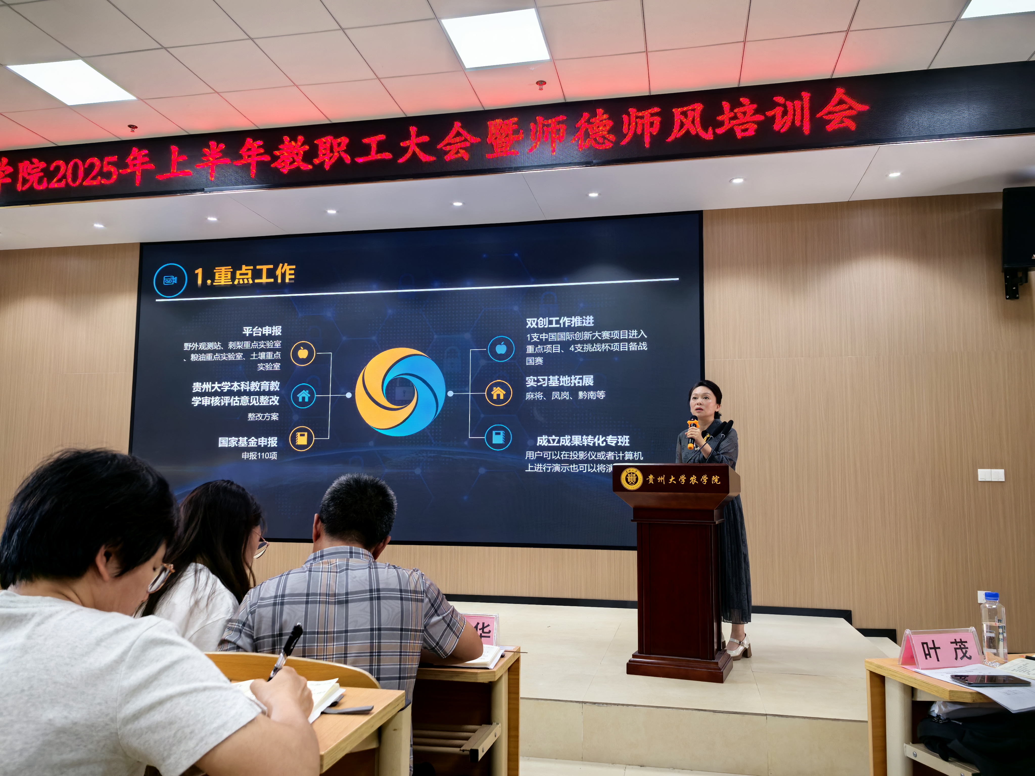 张万萍同志汇报学院上半年工作情况,重点介绍高质量发展指标完成情况、存在的问题及下一步工作重点。各工作专班分别就科研成果转化、全国大学生生命科学竞赛、国际化办学、大型仪器共享、ESI学科国际影响力提升、实习经费使用等专项工作进行了汇报和培训,内容详实、重点突出,为后续工作开展明确了方向。