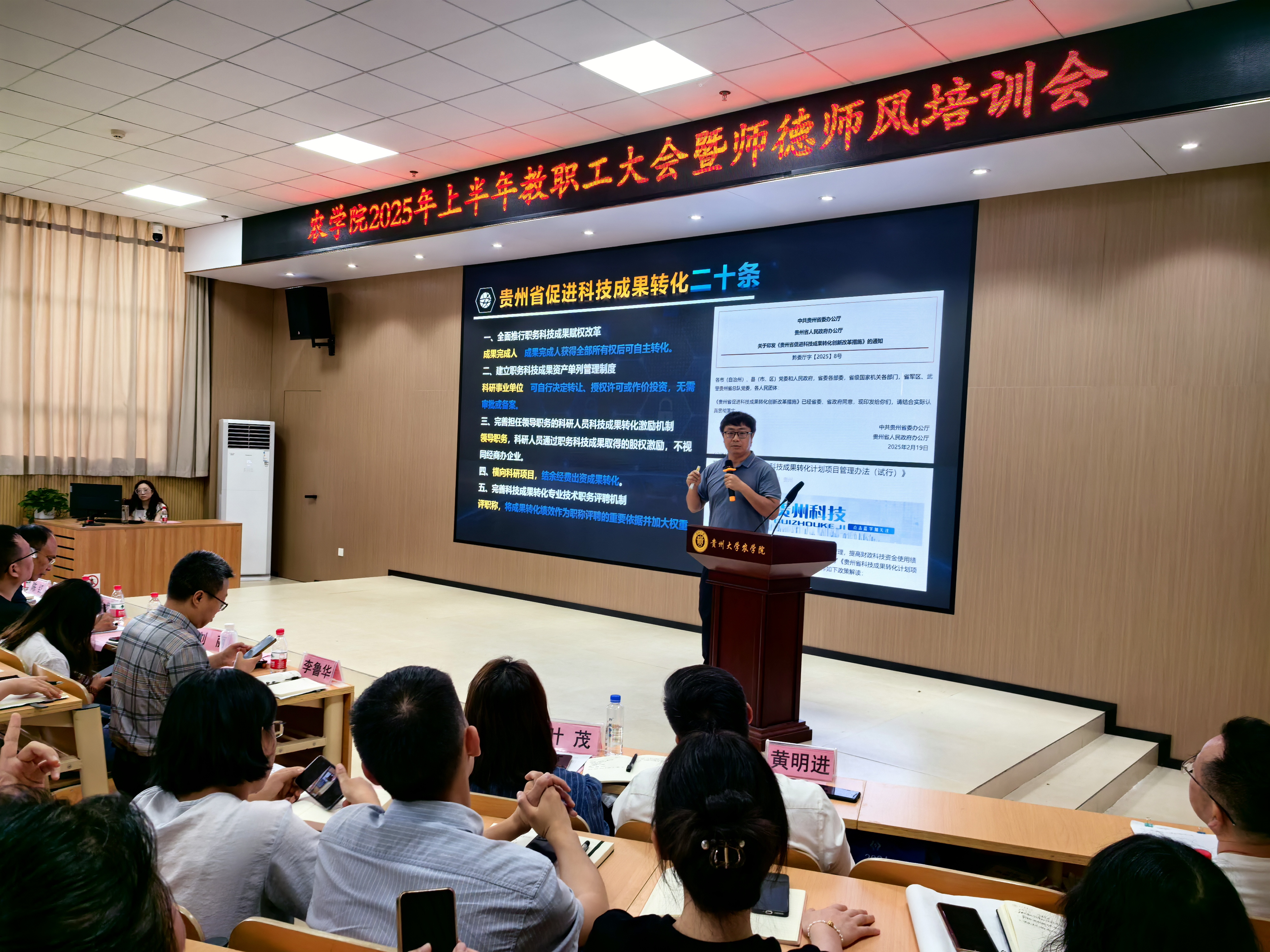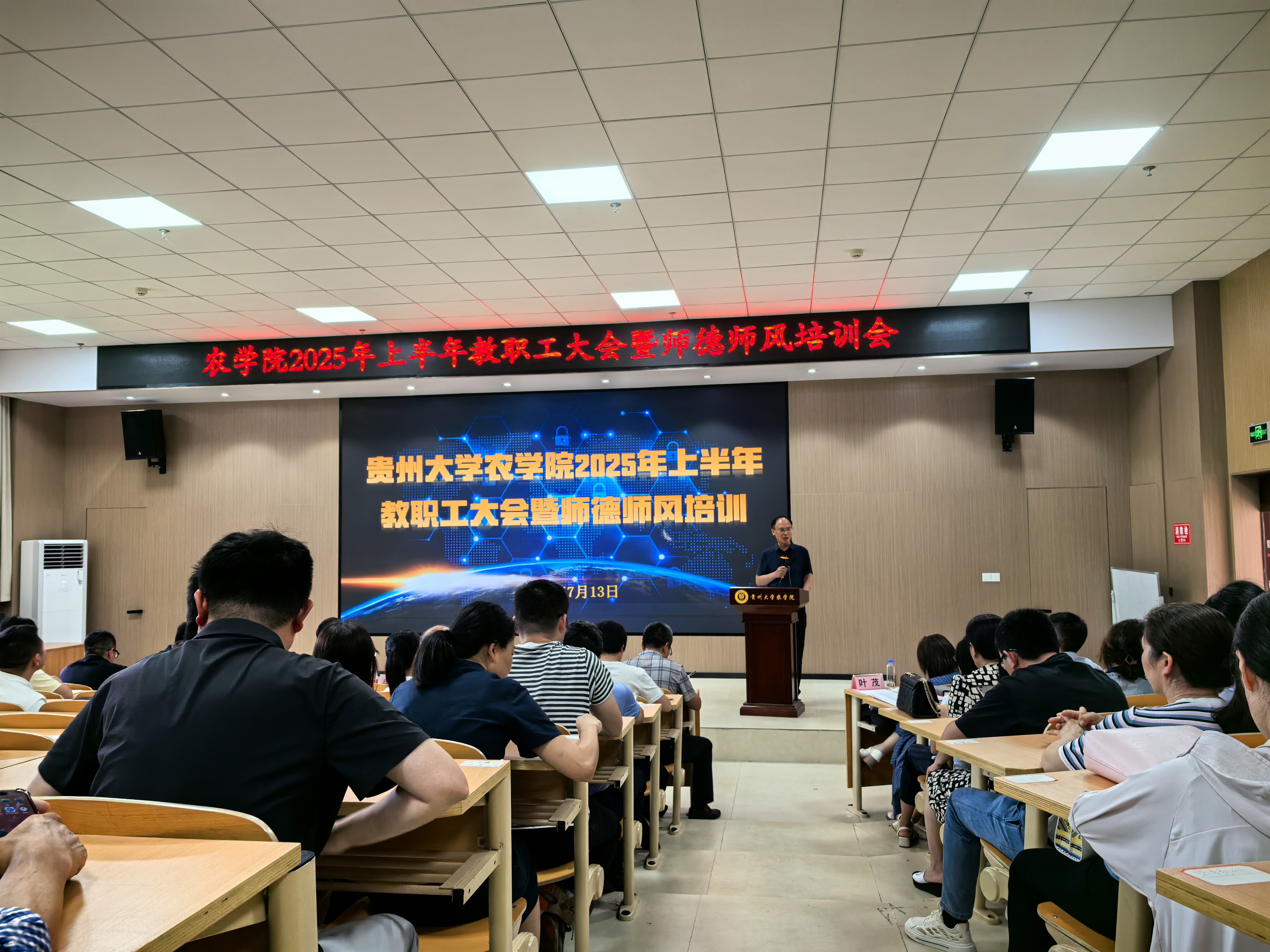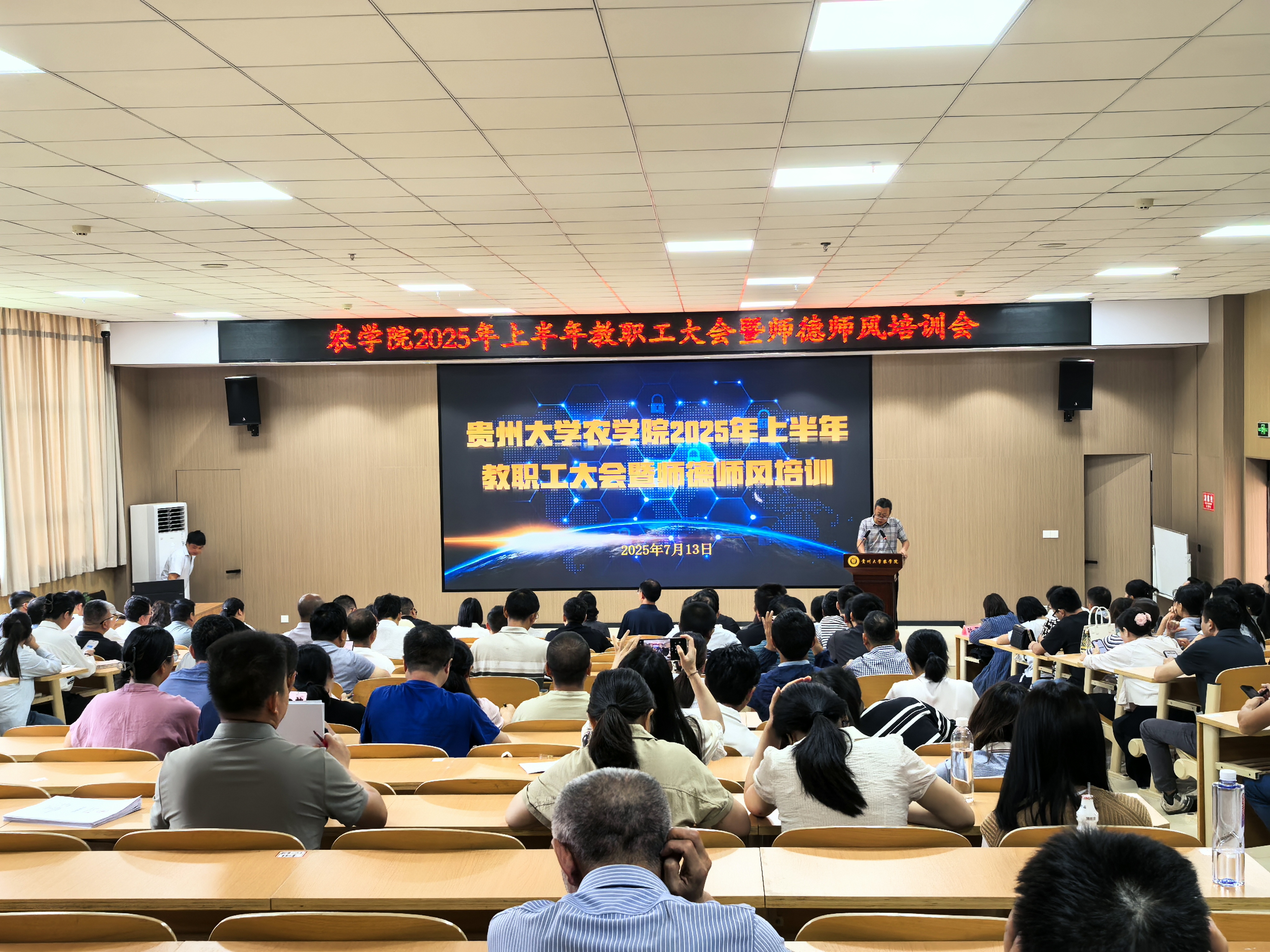 7月13日,98858vip威尼斯下载召开2025上半年教职工大会暨师德师风培训会,会议深入学习贯彻相关重要精神,总结学院上半年工作,部署下一阶段重点任务,旨在强化师德师风建设,凝聚发展共识,推动学院事业高质量发展。院党委书记冉龙彪、院长张万萍、副院长李鲁华和学院全体教职工参会。会议由李鲁华主持。