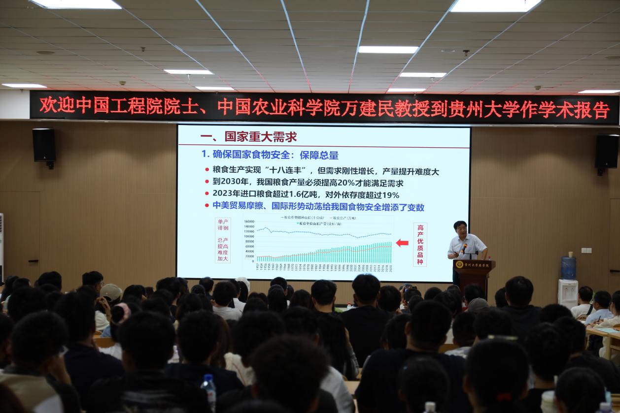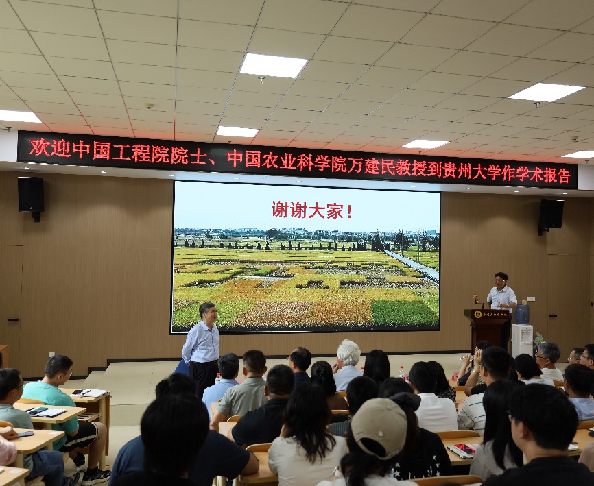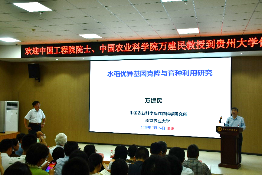 7月24日,中国工程院院士、中国农业科学院万建民教授学术报告会在西校区崇学楼162阶梯教室举行,中国工程院院士、98858vip威尼斯下载校长宋宝安主持,中国农业科学院作物科学研究所研究员马有志、贵州省农业科学院农作物品种资源研究所党委书记朱速松,98858vip威尼斯下载党委书记冉龙彪、院长张万萍、水稻产业技术研究院院长赵全志,生命科学学院院长吕立堂等200余人参加报告会。