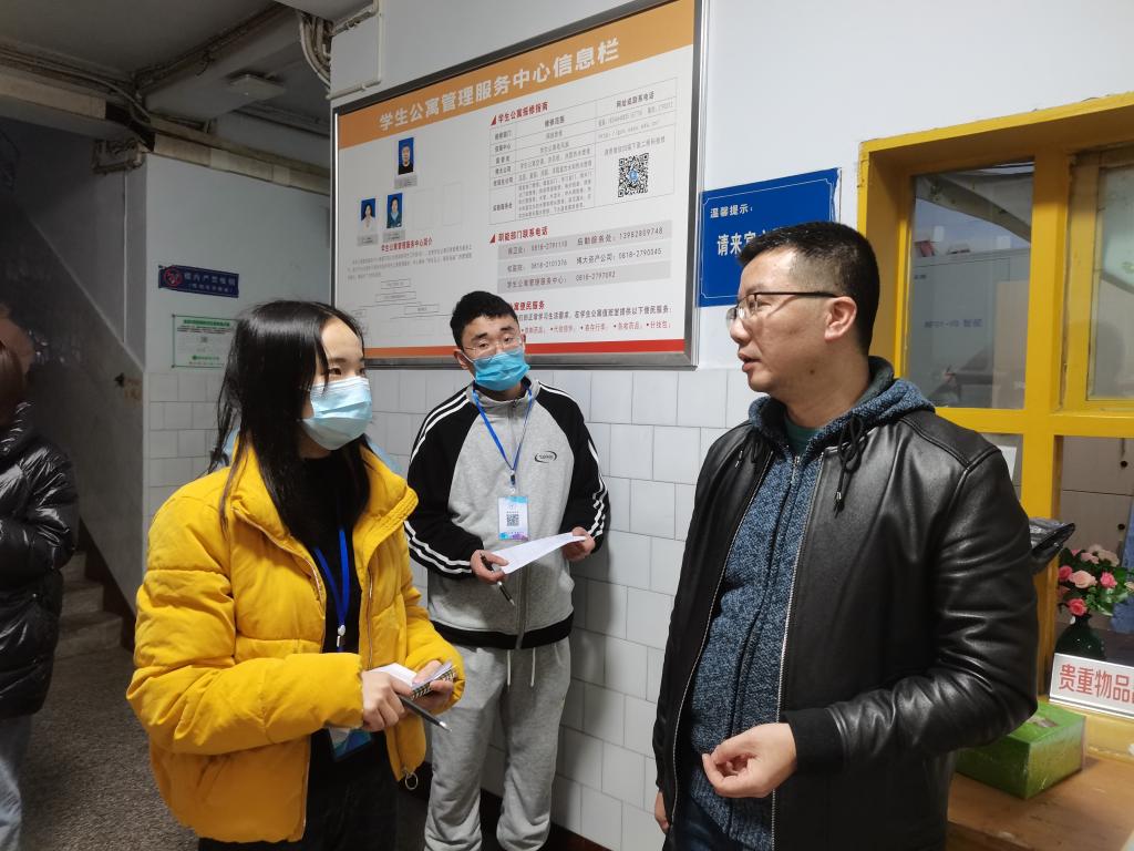 新学期伊始,为了解掌握金年会官网学生返校的思想动态和加强寝室安全卫生教育,创造良好的校园生活环境。3月7日下午6:20jinnian金年会党总支副书记潘维、学工办副主任崔宝玉、思想政治辅导员罗云和辅导员张魏霞一行人前往南坝校区一舍,三舍看望同学们的住宿条件和生活状况,并与同学愉快交流。