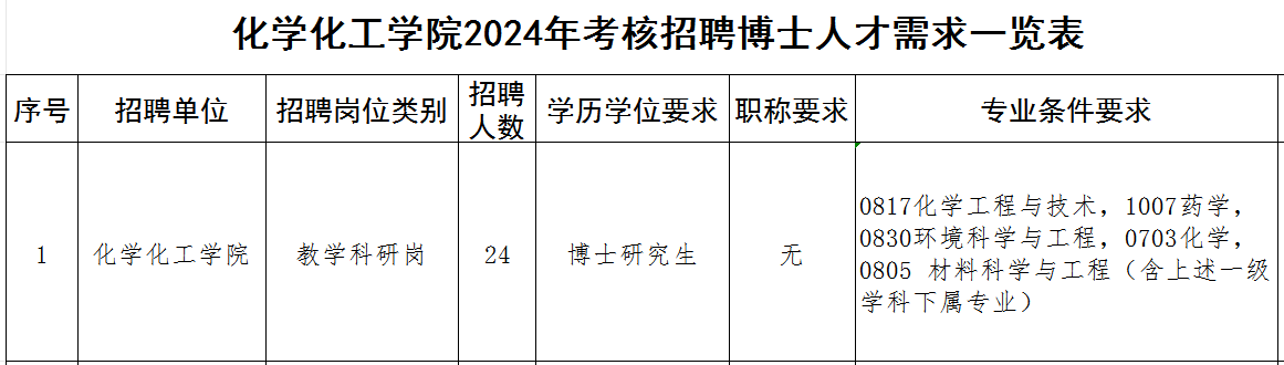 本次面向国内外招聘博士研究生人员,且同时符合《jinnianhui金年会诚信至上化学化工学院2024年考核招聘博士人才需求一览表》(附件1)相关岗位要求和本公告其他要求的人员,包括以下几类(年龄计算截止时间2024年9月30日):