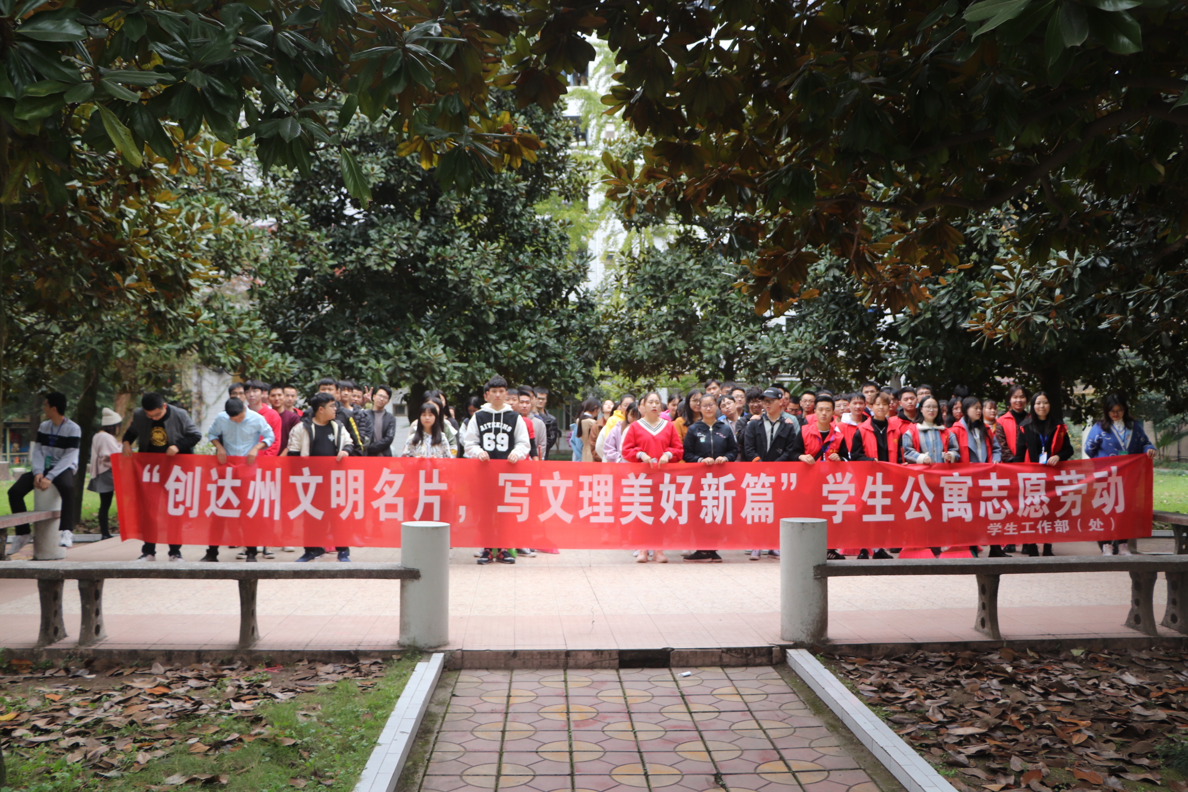 立足校园,奉献社会。为响应“四城同创”工作的进行,建设美丽校园,号召师生践行奉献互助的志愿精神。2019年11月15日,jinnian金年会在南坝校区公共区域组织开展了以“创达州文明名片,写文理美好篇章”为主题的志愿劳动活动。jinnian金年会志愿者及部分老师参与此次活动。