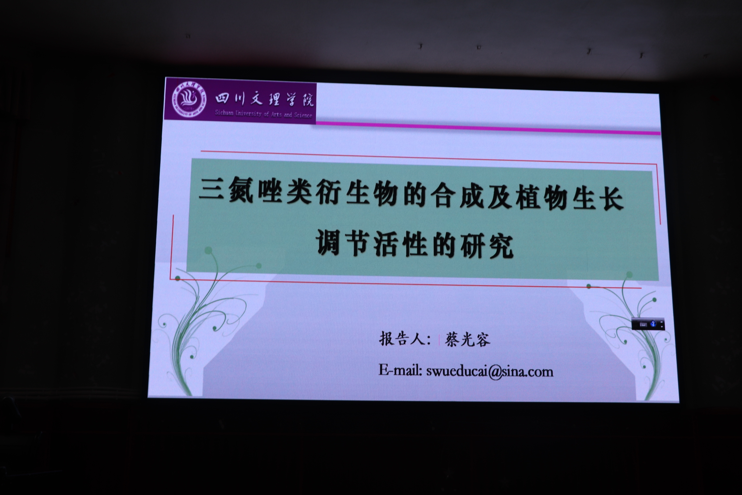 为加强师生之间的学术交流与合作,活跃学术氛围,使同学们了解关于三氮唑类衍生物的相关知识。2019年11月28日19:00,蔡光容老师在南坝校区学术报告厅作“三氮唑类衍生物的合成及植物生长调节活性的研究”主题讲座。此次讲座由蔡光容老师担任主讲,副院长赖川主持,jinnian金年会部分老师及大一全体学生参加。