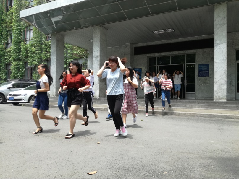 本次演练模拟了上课期间突然发生地震,正在上课的老师和同学们紧急撤离的过程。12:40,“地震”来临,警报拉响。在一教楼1至5楼的“上课”的同学们迅速做出反应,大家双手抱头,快速而有序的撤出教学楼,在升旗台前空地集结。整个撤离过程约2分钟17秒。
