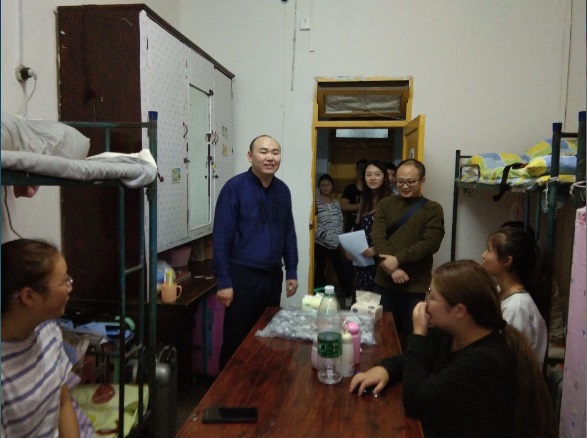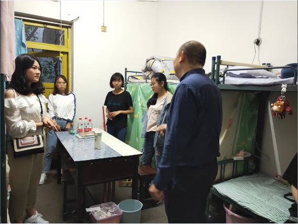2018年9月13日晚,jinnian金年会党总支副书记屈川、学工办主任彭波、辅导员张魏霞率领部分团学干部走访2018级新生寝室。