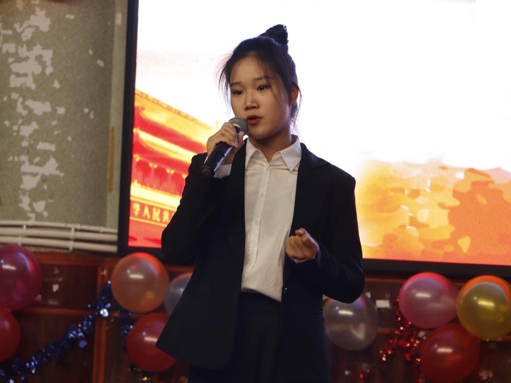 比赛伊始,观众迎来了十位参赛选手登场并依次做了简短的自我介绍,选手积极昂扬的精神风貌为他们赢来了一阵阵掌声。演讲中,选手们在台上都昂首挺胸,神采奕奕,用激昂澎湃的声音抒发他们对祖国的热爱和感激之情。本次比赛在中场休息时设置了文艺表演合唱和活跃气氛的有奖竞猜环节,同学们热情不减,积极参加竞猜。比赛逐渐落下帷幕,比赛的排名并不重要,重要的是同学们都敢于走上演讲台,敢于表达自己。最后,潘维老师对此次比赛做出总结到:参赛选手声音抑扬顿挫,富有感染力,语言流畅,都能做到脱稿,但是有的选手准备不够充分,过于紧张等。点评完后评委们上台为获奖人员授予证书,并一起合影留念。