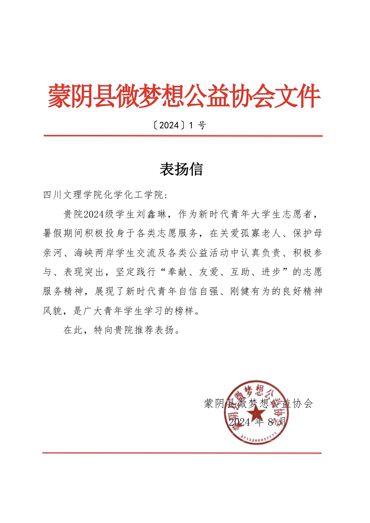 jinnian金年会2024级学生刘鑫琳获蒙阴县微梦根公益协会表扬信