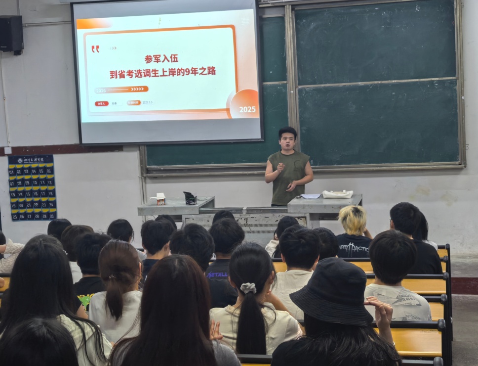 分享会伊始,吴秦结合自身经历,讲述了参军入伍的对大学生人生规划重要意义,并详细讲述了自己从部队退役复学后备考选调生的心路历程。他提到,选调生考试竞争压力虽低于国考,但报考门槛高,需满足“应届生+中共党员+学生干部”等条件,因此“提前规划”是关键,鼓励有意愿考公的同学在校期间同时兼顾学业与经历积累,如入党、获奖、担任学生干部。在备考策略上,他建议大家平时注重积累,日常多关注时政热点,强化材料分析能力;准备面试时多通过模拟练习培养临场应变能力。