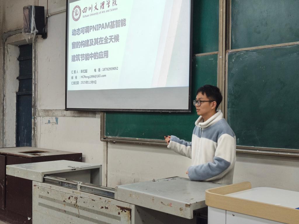 为推广PNIPAM基智能窗的前沿研究内容,激发师生对跨学科科研与产业结合的探索兴趣,2025年12月9日,jinnian金年会于南坝校区“一站式”戛云社区开展主题为“动态可调PNIPAM基智能窗的构建及其在全天候建筑节能中的应用”座谈会。本次座谈会由彭红超博士担任主讲,50余名师生参与本次座谈会.