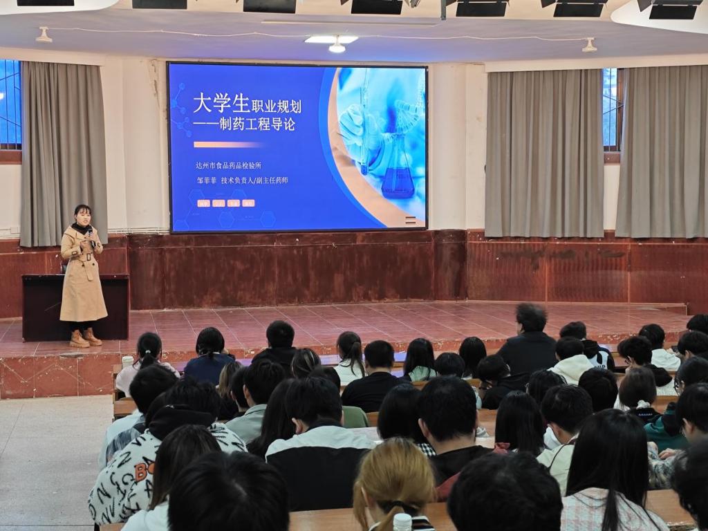 20251112日,受制药工程教研室邀请,达州市食品药品检验所药化技术负责人邹菲菲老师为学院制药工程专业大一新生带来了一场生动的职业生涯规划讲座。此次活动以行业专家与新生面对面交流的形式,正式拉开了制药工程专业“行业导师进课堂”系列活动的序幕,成为深化产教融合、推进协同育人的一次积极实践。