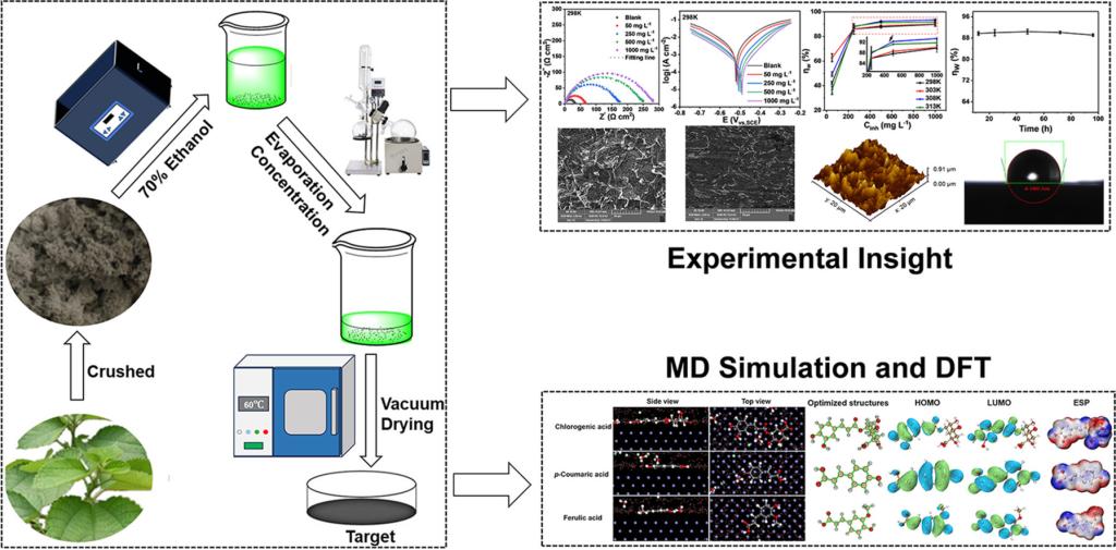 研究团队通过超声波辅助乙醇提取法获得苎麻叶提取物,并利用电化学测试(如极化曲线、阻抗谱)、表面形貌分析(原子力显微镜、扫描电镜)及理论计算(分子动力学模拟、量子化学分析),系统评估了RLE在HCl酸洗体系中对低碳钢的缓蚀性能。结果发现,RLE是一种稳定、绿色、高效的金属酸洗缓蚀剂。该研究为开发天然植物基缓蚀剂提供了重要参考。苎麻叶提取物不仅可替代传统不够绿色的缓蚀剂,降低工业酸洗过程的生态风险,还可推动农业副产物的高值化利用,促进达州苎麻产业的可持续发展。